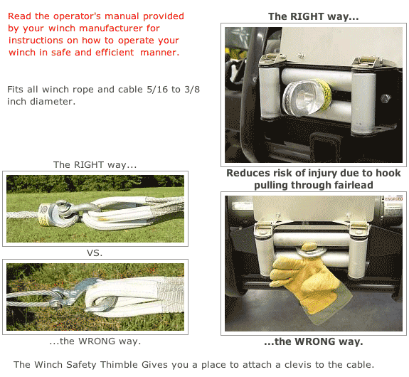 Price: $350.00 The 2 1/2 inch diameter aluminum alloy Safety Thimble won't pull through your fairlead. It only weighs approx. 9 ozs. (less than half that of winch hooks) thus reducing the risk of injury. No open hook to fall off anchor point. Large radius bend and support groove decrease potential failure points.